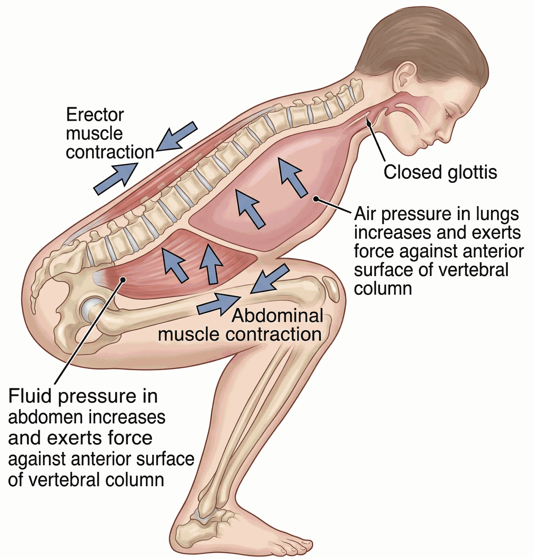 The human spine is actually designed to take really heavy loads without sustaining any damage provided the spine is neutral i.e. the back is 'flat' during the lift — which is aided by proper breathing technique known as the Valsalva maneuver.